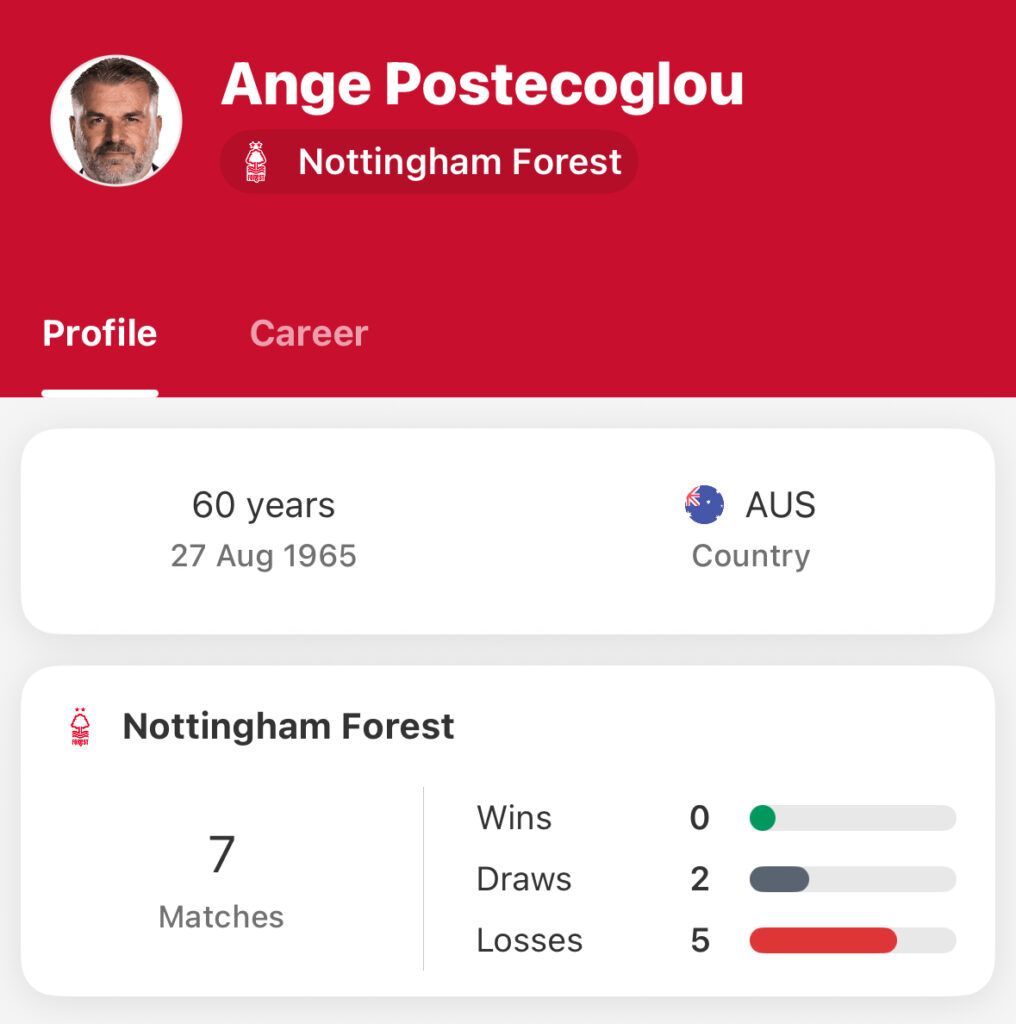 The numbers paint a bleak picture. Having conceded 15 goals, suffered five defeats and drawn twice, Postecoglou has endured a nightmare start to his tenure, becoming the first permanent Forest manager in a century to go winless in his opening six matches, with their 2-0 defeat to Newcastle making it even worse.