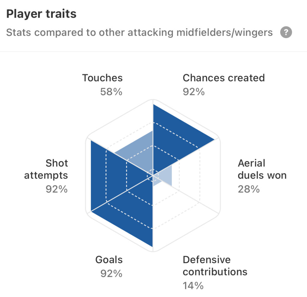 Estêvão clearly isn’t afraid to have a go either, averaging 1.4 shots per 90 minutes, with only the injured Liam Delap ahead of him, but as their number nine, taking shots is the very least he could do, with a total xG of 1.6 across his six Premier League appearances.