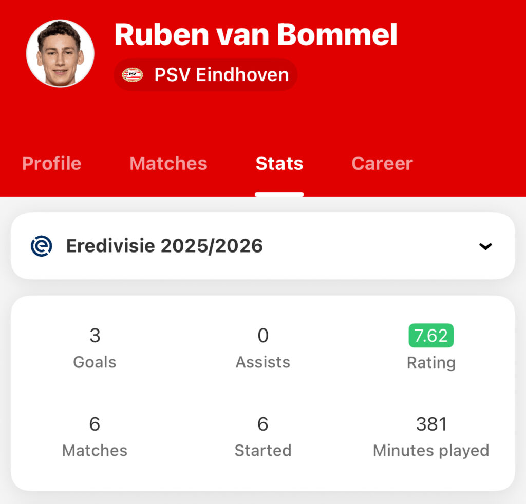 Perhaps the furthest along in their development is Ruben van Bommel, son of Dutch hardman Mark. Unlike his defender old man, Ruben is a left winger, who learned his trade at AZ Alkmaar, breaking into the first team in 2023 and going on to score 17 goals and provide six assists in his 73 games for the club.