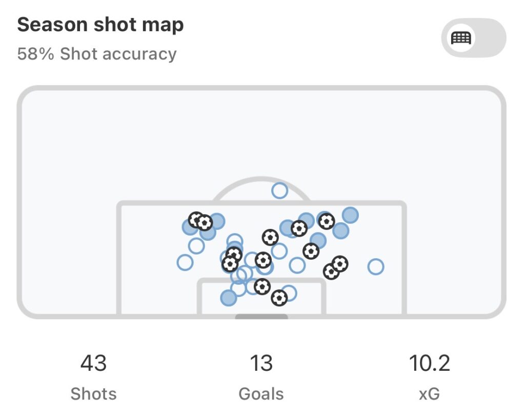 He has a Non-Penalty Expected Goals per 90 average of 1.07 and his NPxG+xA average is 1.2 per 90. His previous best for City was the 2022/23 campaign when he finished with 0.96. Now, the sample size isn’t the largest but we are almost a third of the way into the season. This isn’t just a purple patch.